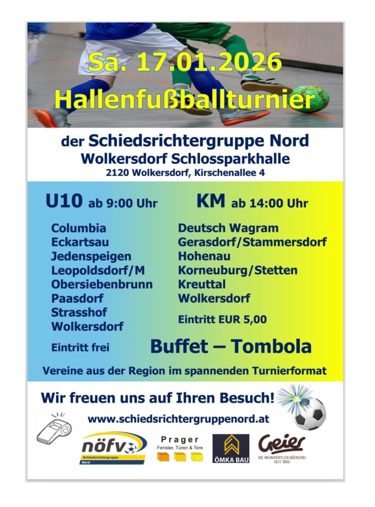 Am Samstag den 18.01 fand unser alljährliches Hallenturnier in der Wolkersdorf statt. In der ausverkauften Halle wurden die Mannschaften mit einer großartige Stimmung unterstützt. Beim stark besuchten Turnier waren auch einige Ehrengäste anwesend, so auch der Präsident des NÖFV Johann Gartner, der Obmann des NÖSK Alois Pemmer, Hauptgruppen Obmann Stellvertreter Manfred Glassl sowie Stadtrat Josef Siebenhandl.